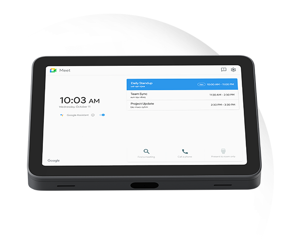 Zarządzanie spotkaniami jest wyjątkowo intuicyjne dzięki dotykowemu panelowi sterowania, który umożliwia rozpoczęcie własnej konferencji lub dołączenie do trwającego spotkania za pomocą jednego przycisku. Proces ten jest dodatkowo usprawniony przez ścisłą integrację z kalendarzem Google Workspace, co znacznie ułatwia rezerwację terminów. Kontroler pełni również funkcję centrum udostępniania treści. Został wyposażony w zintegrowane wejście HDMI, pozwalające na natychmiastowe rozpoczęcie lokalnej prezentacji – wystarczy podłączyć komputer, aby udostępnić materiały zespołowi. Panel oferuje standardowe złącza HDMI i USB-C oraz dedykowany port USB downstream do podłączenia zestawu głośnomówiącego. W komplecie znajduje się 5-metrowy aktywny kabel USB A-C, a wbudowany czujnik światła otoczenia automatycznie dba o komfort, dostosowując jasność ekranu do warunków panujących w pomieszczeniu.