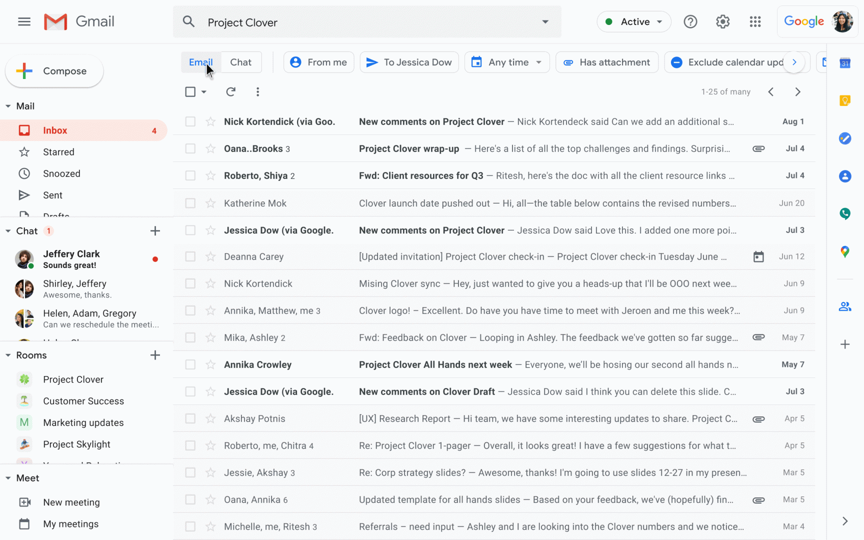 Twoja skrzynka odbiorcza to nie tylko wiadomości, ale też osoby, od których je dostajesz. Czat tekstowy, głosowy i wideo pozwala zobaczyć, kto jest online, i natychmiast się połączyć. Obok każdego e-maila widzisz zdjęcie profilowe kontaktu, najnowsze aktualizacje i wspólne dokumenty.