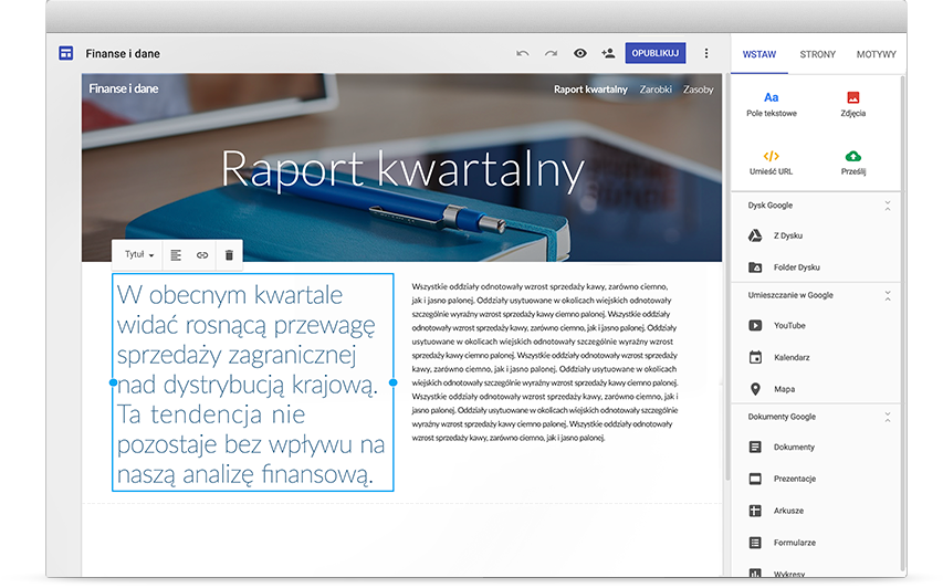 Twórz witryny projektów, np. intranet, bez napisania choćby jednej linii kodu. To tak proste, jak przygotowanie dokumentu. Aby zaoszczędzić jeszcze więcej czasu, możesz wybrać spośród setek gotowych szablonów.